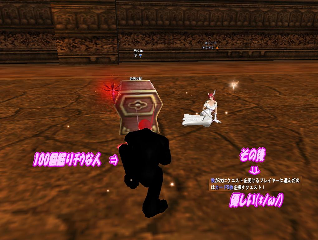 ギルドの方と数名ぉ約束をしましたので ちゃんとUPしておきます(・ω・`;) 「ガ」だけ伏せなくて d(´ω`。)OK♪とのことなので 載せましたが会話の内容ゎ これがイッパイイッパイです>< とても恐ろしくて公表できません(>ω<`;) こわひこわひ(pωq)w 最近万界で(*゚ρ゚) ボーっと してることが多いのですが 特にオク前でいたりもするんですが 気がついたらメンズ2名に 挟まれておりましたΣ(ΦωΦ) wisがきて「挟んでごめんなさい」とw 思わず遊んでしまいました(*´pq`)クスクスッ 赤い人の電車ごっこだそうです(・ω´・+)b そしてまたもや万界で オク前で張り付いていたら 無言拉致キタ(゚∀゚)コレ!! わけもわからず85Dへ拉致られましたorz ココ実装初日で入り口付近で 泣いて帰った記憶しかなく久しぶりにきたんですけど やっぱり2度と逝きたくなひ>< セーレというボスまでたどり着いたのでが ココにつくまでにチェルノとやらに 散々やられてこのセーレにも2度ほど(つД∩ 結局札削られまくってQP10個が お亡くなりになりました(´・ω・`) 出たものも少なかったので ルレになり収穫0 _| ̄|Σ====○ でもセーレゎイターイ範囲が前方にしかない ということがわかったのですが あたしゎ用がないDなので できれば避けて逝きたくないDです(´;ω;`) 今日99魔Dへ2週逝ってきたのですが ェΣ(´・ω・`)・・・(´゚д゚ )ノ` マユゲトレタ 1週1冊×2 出る時ゎでるんですね~(ノω`*) でも仙精霊本くださいょっ!w あたしのリザへの道ゎ まだまだ遠ぃのであった(`・ω・´) (所持金についてゎスルーで!)